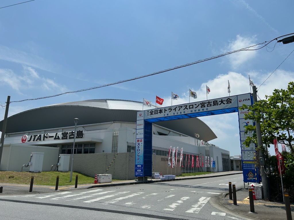 「JTAドーム宮古島」という名前は、宮古島市と日本トランスオーシャン航空(JTA)とのネーミングライツ契約によるものです。正式には “宮古島市スポーツ観光交流拠点施設” ですが、JALの鶴丸が彩りを添えています。